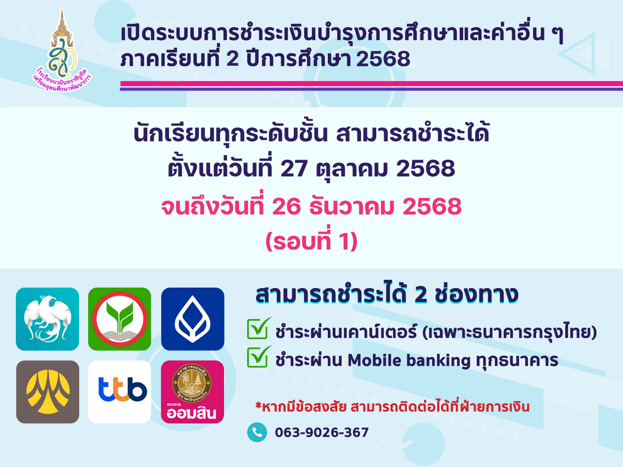 การชำระค่าบำรุงการศึกษาและค่าชมรมผู้ปกครองและครู ภาคเรียนที่ 2 ปีการศึกษา 2568
